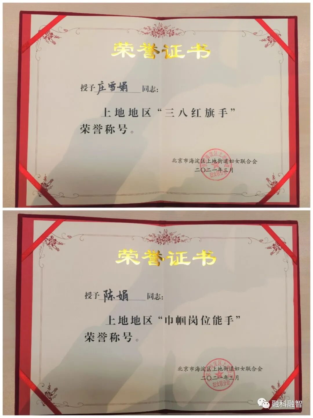 会上,街道办事处副主任于秀红同志宣读《关于表彰上地街道三八红旗手、巾帼岗位能手、最美家庭及平安示范家庭的决定》。予融科融智党支部成员庄雪娟上地地区“三八红旗手”荣誉称号、授予融科融智党支部成员陈娟上地地区“巾帼岗位能手”荣誉称号。